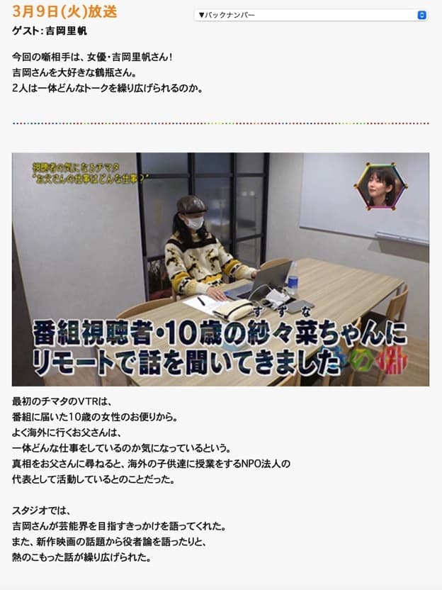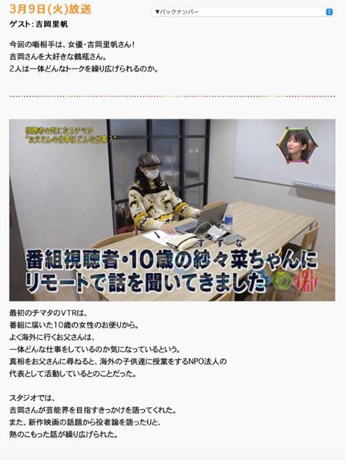 スタッフは紗々菜さんの父・雄一さんを直撃!世界のいろいろな国で授業をしながら、教育支援をする活動をしているそうで、アフリカを中心とした海外の子どもたちに授業をするNPO法人の代表をしているという。スタジオの鶴瓶と吉岡は、「素晴らしい活動ですね!」などと感想を話し合った。