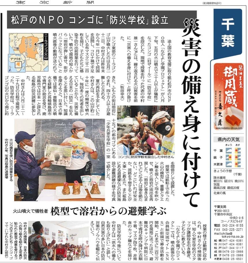 途上国の教育支援に取り組む松戸市のNPO法人「なかよし学園プロジェクト」が八月下旬、五月の火山噴火で三十人以上が犠牲になったコンゴ(旧ザイール)に「防災学校」を設立した。現地で授業を行った代表の中村雄一さん(43)は、繰り返される火山被害を前に「災害への備えを身に付けて」と呼び掛けた。(牧田幸夫)