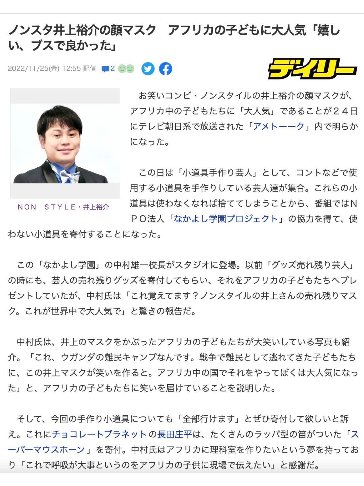 なかよし学園中村雄一代表が「アメトーーク」とのコラボ以来世界各国で行なっている、NONSTYLE井上マスクを使った授業がYahooニュースで紹介されました。