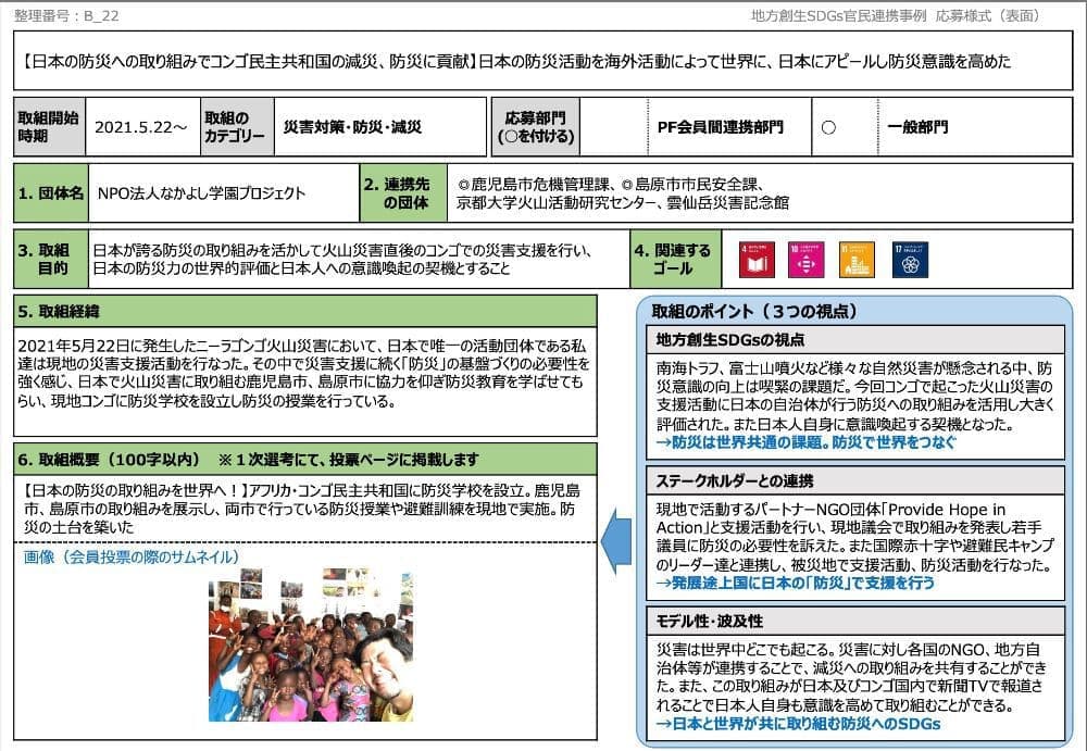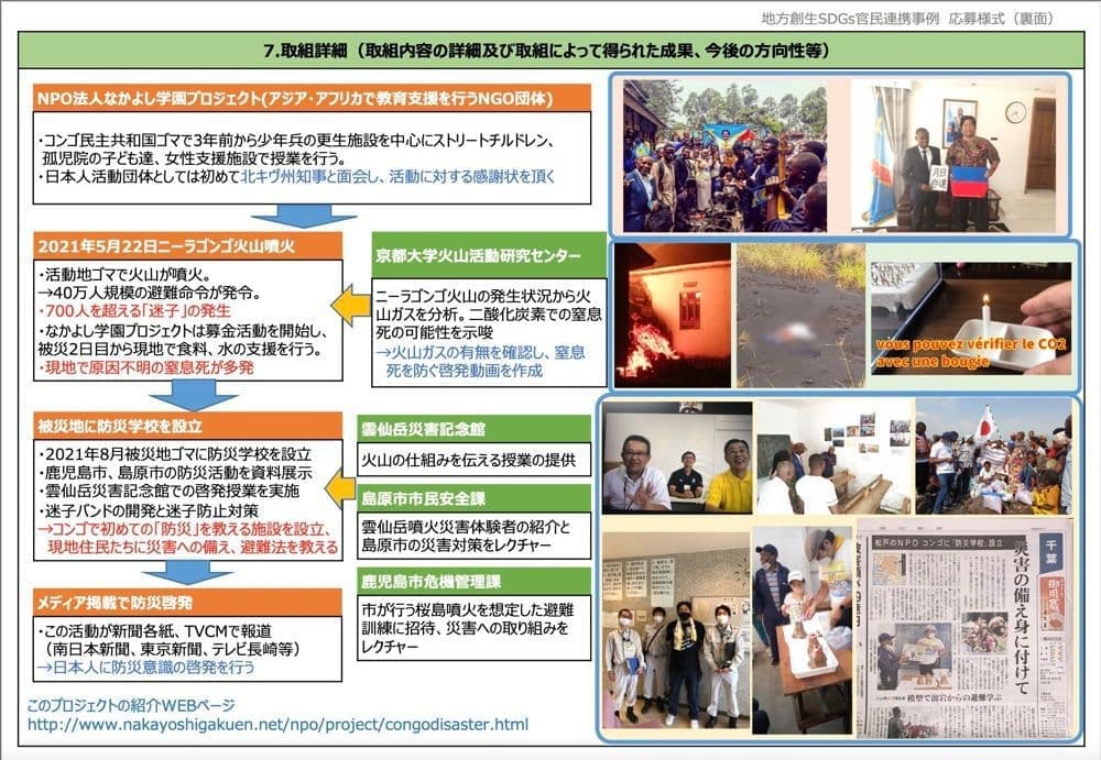 The efforts of the "Nakayoshi Disaster Prevention School" conducted by our Nakayoshi Gakuen Project in the Democratic Republic of the Congo were introduced on the Cabinet Office page as an example of public-private partnership.
