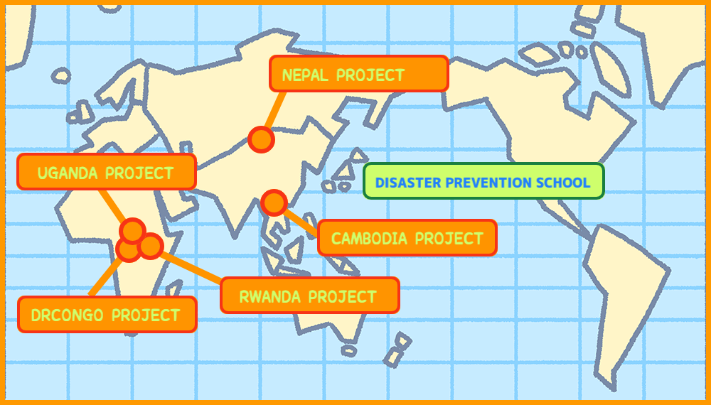 PARTNERSHIPS | ・PROVIDE HOPE IN ACTION(DRC) ・KIBAGABAGA SCHOOL(RWANDA) ・RWAMWANJA REFUGEE CAMP(UGANDA) ・GOMA REFUGEE CAMP(DRC) ・RED CROSS GOMA(DRC) ・CSHD(CAMBODIA) ・Crisis Management Division, Kagoshima City, Kagoshima Prefecture(JAPAN) ・Kyoto University Disaster Prevention Research Institute Volcanic Activity Research Center(JAPAN) ・Citizen Safety Division, Shimabara City, Nagasaki Prefecture(JAPAN) ・Unzendake Disaster Memorial Hall (Gamadasu Dome) Partnership with many other schools, orphanages, and community hospitals |