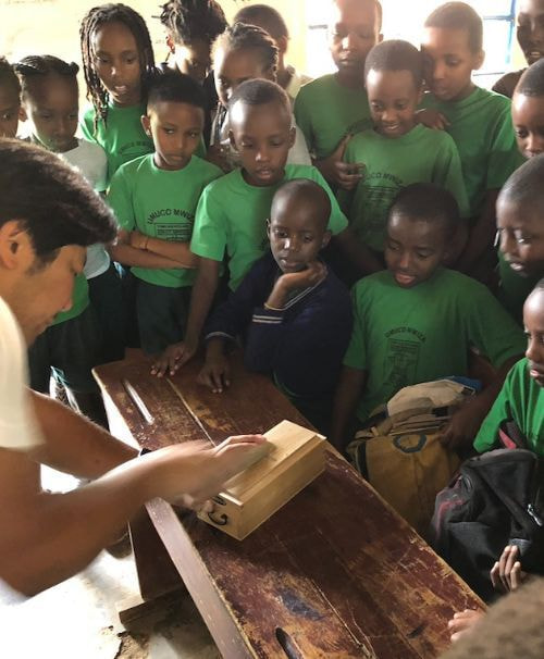 Schools have been established one after another in Rwanda due to remarkable development in recent years, but there are still many areas where there is a large gap with the rural areas and the city areas. In rural areas, there are not enough writing tools. Students are very pleased with the class of experiencing "density" using "Katsuobushi, the hardest food in the world" as a teaching tool.