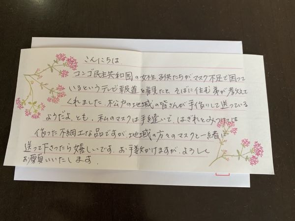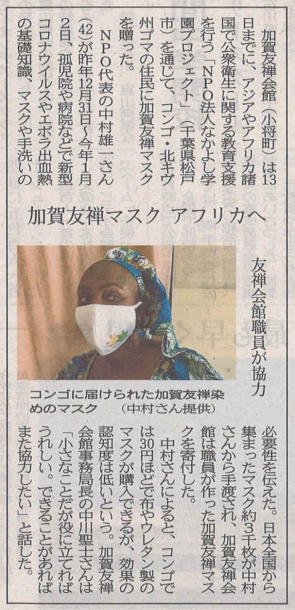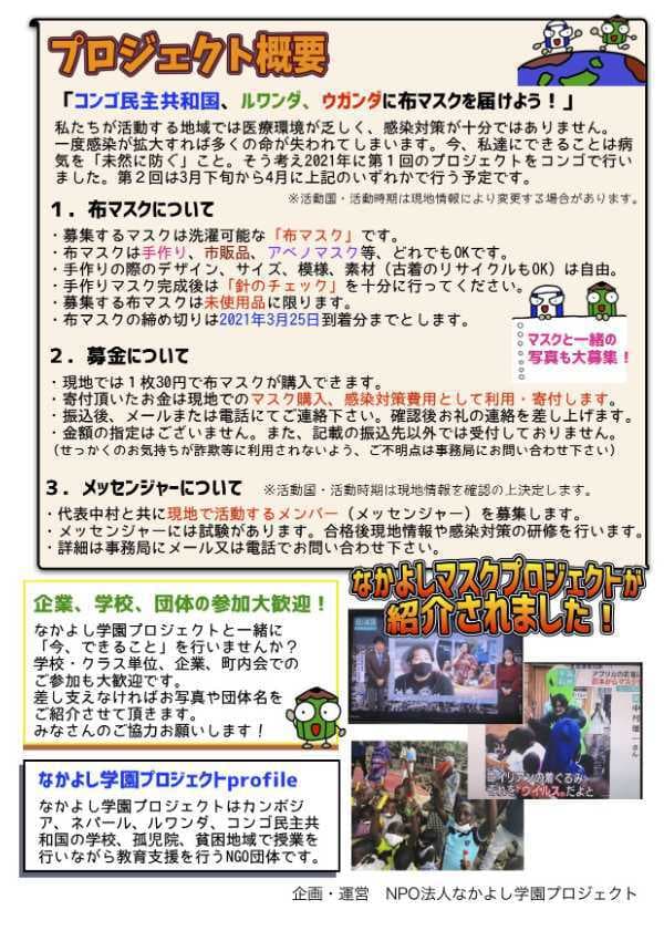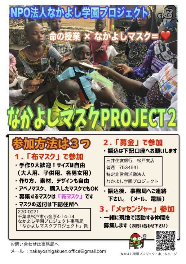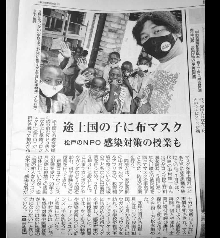 2020年12月31日。私は単身コンゴ民主共和国に渡り、2021年1月1日にウイルス防止の授業イベントを行いました。「ウイルスとは何か?」「どうやって防いだらいいのか?」を教え、皆さんから預かったなかよしマスクをプレゼントしました。また、孤児院、少年院更生施設、市中病院を周りなかよしマスクを渡してきました。予防対策を一人でも多くの人が取ることで失われる命を守る、「命を守る授業」を続けていきたいと思います。