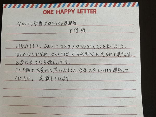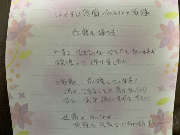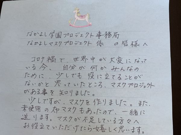 新型コロナウイルスの猛威が世界中で続く中、私達は「今、自分にできること」をずっと考えてきました。その中で見つけたのが「感染予防で命を守る」というプロジェクトでした。約1ヶ月という短い期間の私たちの呼びかけに、200名を超える方、小学生がおばあちゃんと一緒に、中学校の生徒会が、大会の無くなった高校生達が、多くの方が集めてくれた3223枚のマスク。