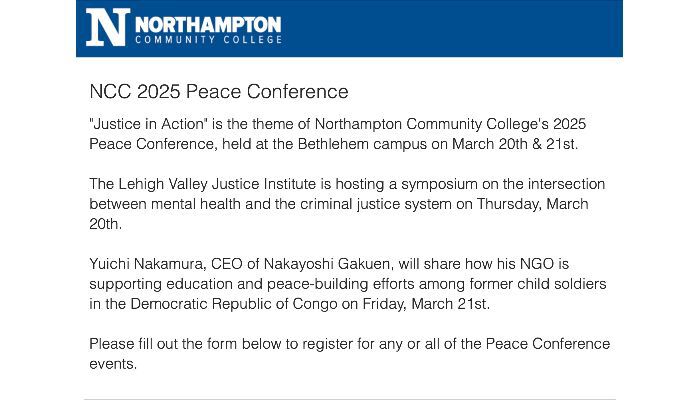 Nakayoshi Gakuen a l'honneur d'annoncer que son PDG, Yuichi Nakamura, prononcera la dernière conférence inaugurale de la Conférence de la Paix 2025 à Northampton Community College à Bethlehem, Pennsylvanie, le 21 mars 2025.