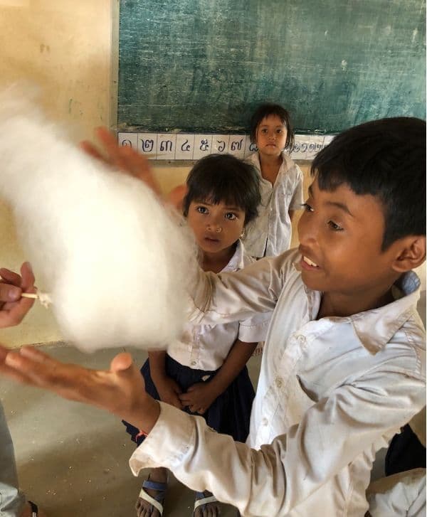 カンボジアの多くの学校では十分な実験道具が無く、教科書を読むだけの授業が続いています。私たちはわたあめ機を持っていって理科の状態変化を説明しながら、実際に自分の目と「味」で科学の面白さを生徒たちに体験させています。