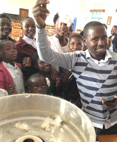 コンゴでは相次ぐ戦争、内戦で市街地は荒廃し、学校がない地域もたくさんあります。そのような地域では「勉強」というものに憧れがありながらも実際に授業を受けたことがない子達がたくさんいます。そこで私たちはわたあめ機を現地に持っていき、理科の授業で状態変化を説明しながら、実際に自分の目と「味」で科学の面白さを生徒たちに体験させる授業を行っています。